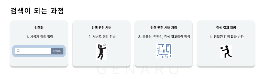 검색 엔진은 사용자가 입력한 검색어를 기반으로 서비스 내에서 수많은 정보를 수집하고 색인화합니다. 이후에는 검색 알고리즘을 사용해, 일반적으로는 가장 관련성이 높은 결과물을 찾아내고 정렬합니다. 사용자는 이 결과 중에서 필요한 정보를 선택하고 해당 페이지로 이동해 내용을 확인합니다.