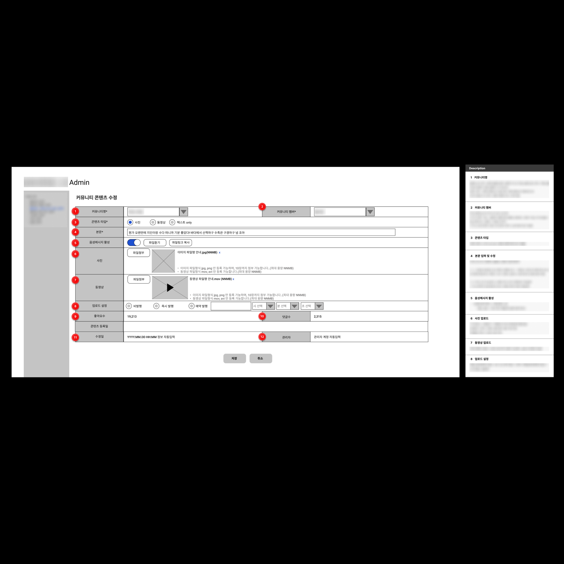 특이사항: 커뮤니티 관리, 포스트 관리, 댓글 관리, 유저 관리, 보상 회수, 미디어 업로드, 공지사항 게시
