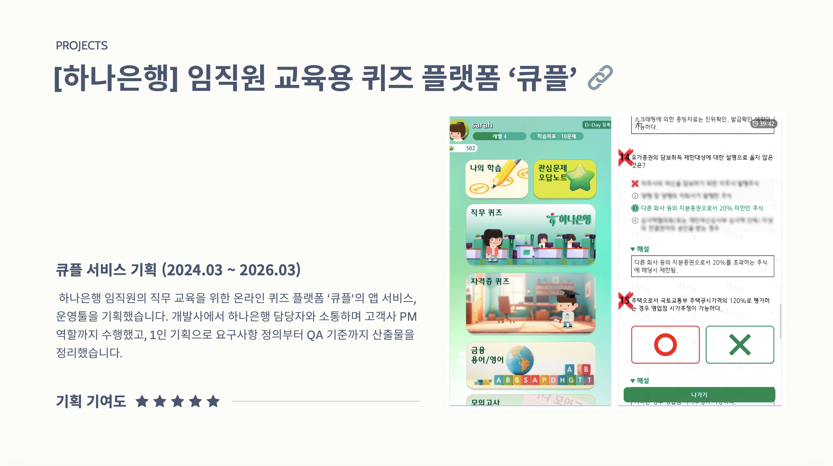 은행 임직원의 직무 교육을 위한 모바일 퀴즈 기반 교육 플랫폼으로, 금융·직무 관련 학습 콘텐츠를 퀴즈 형식으로 제공하여 학습 참여도와 이해도를 높이도록 설계된 B2E(Business to Employee) 교육 서비스 기획 프로젝트입니다.