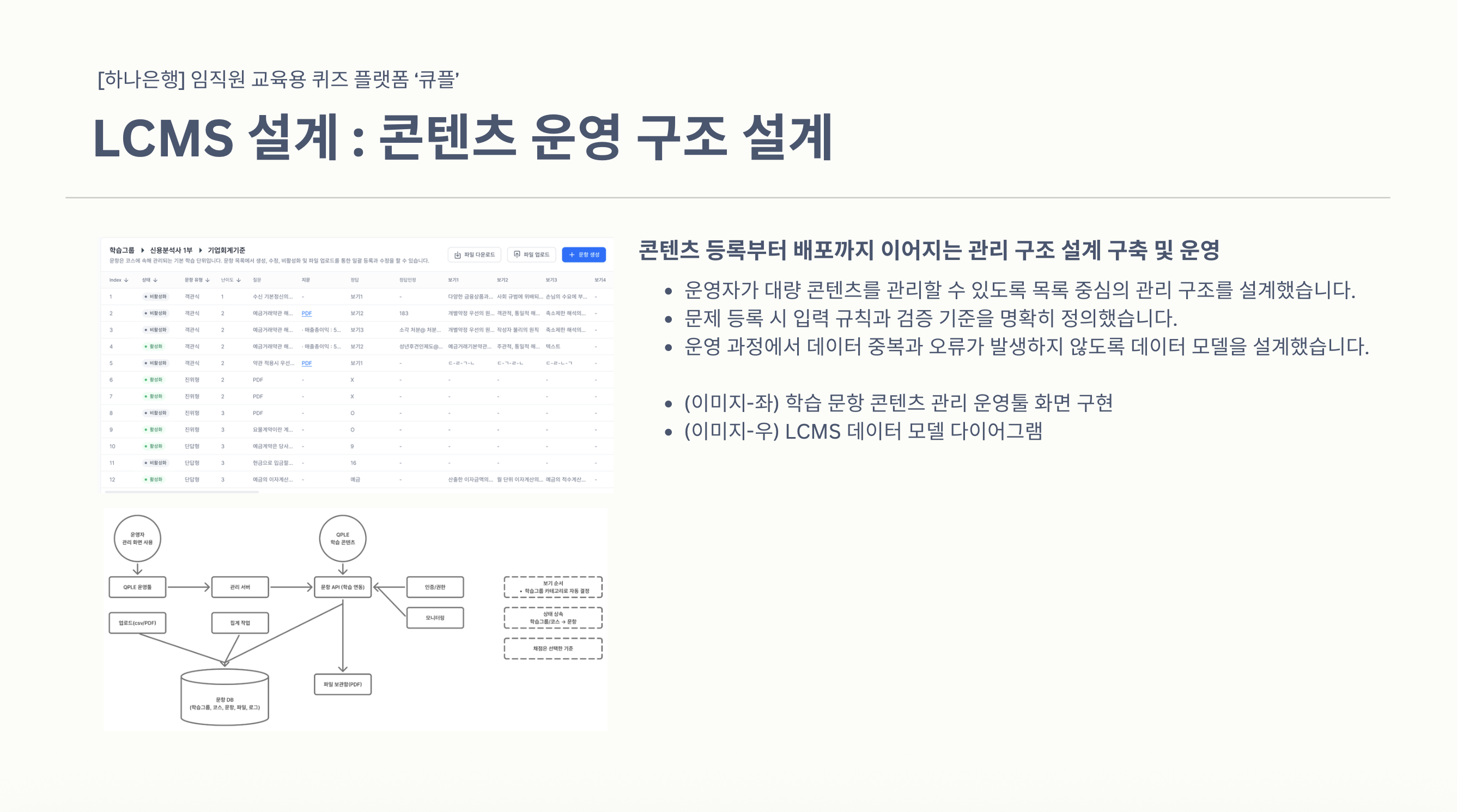 - 운영자가 대량의 교육 콘텐츠를 효율적으로 관리할 수 있도록 목록 중심 LCMS 관리 구조 설계