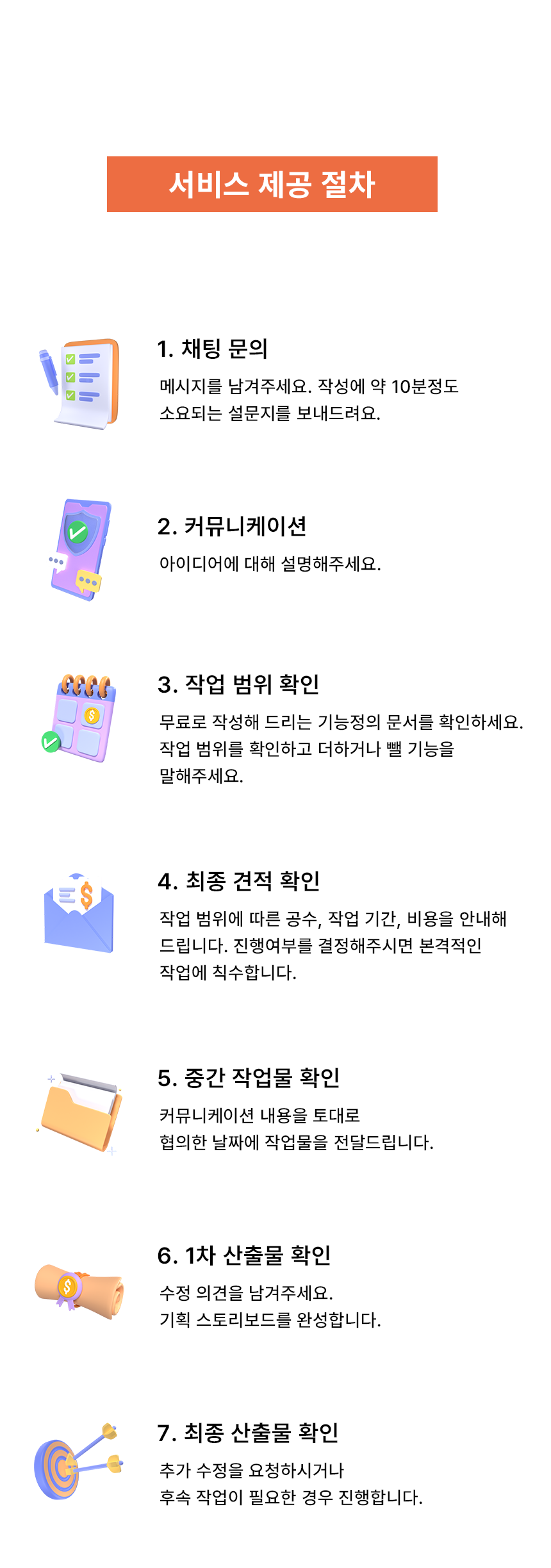 요청주신 내용 뿐 아니라 새로운 아이디어와 구체화 제안까지 함께 기획해 드립니다.