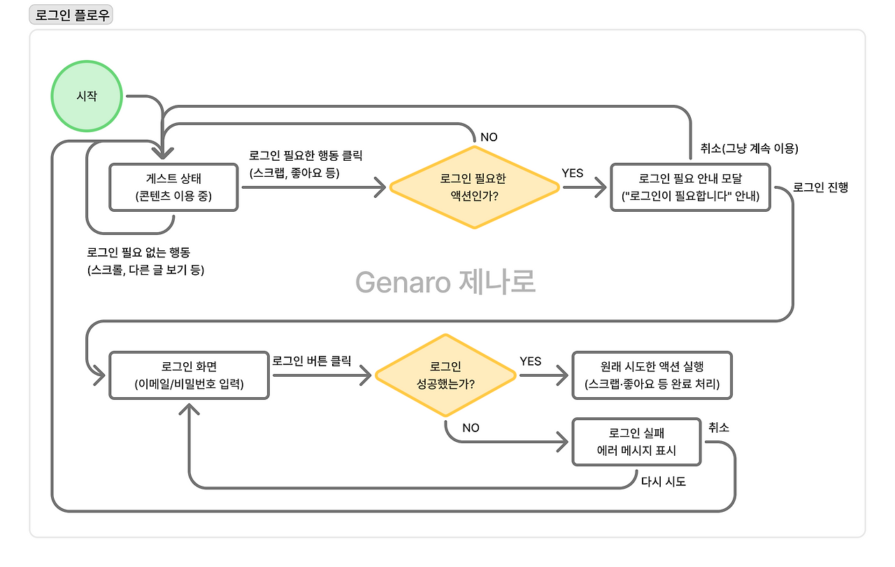 이 흐름이 없으면, 화면이 아무리 많아도 구현 계획이 세워지지 않습니다. 최소한 이 정도의 플로우를 그려주면 개발자와의 대화가 훨씬 덜 피곤해집니다.